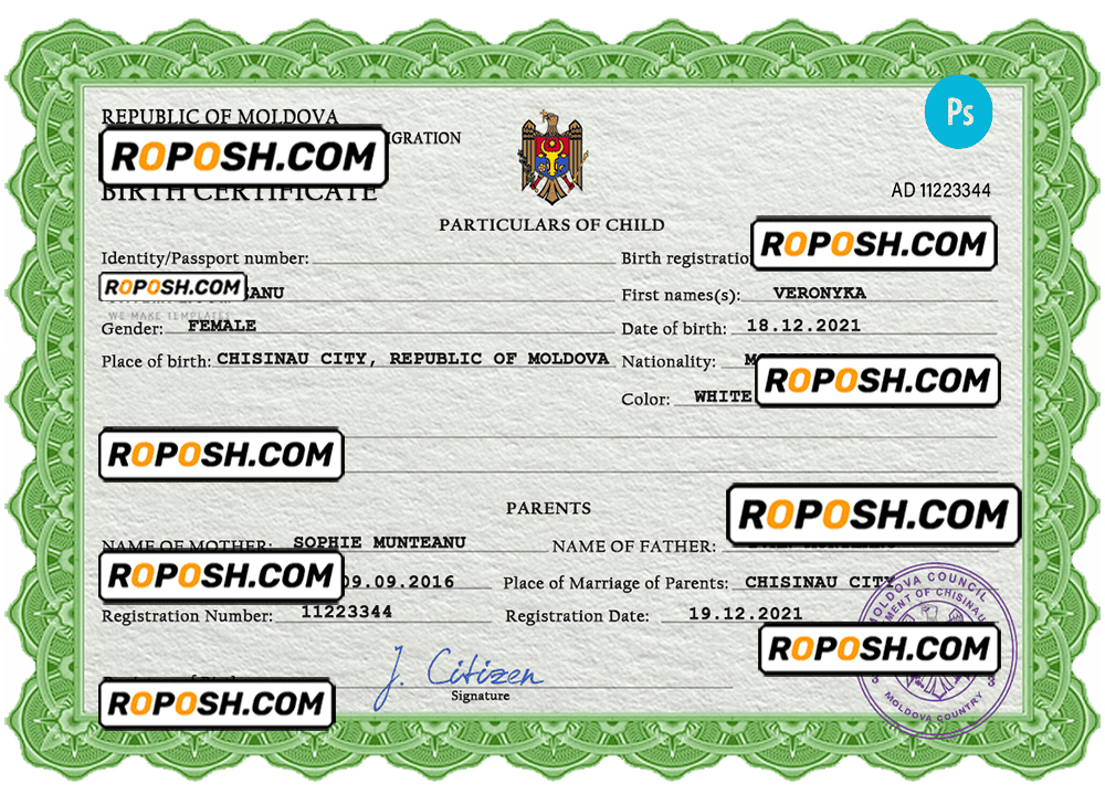roposh offers hundreds of high-quality, realistic, and customizable birth certificates. The Moldova birth certificate template is fully fillable, and you can complete it with any information you wish, such as name, surname, birth date, place of birth and etc. Whether you are using our PSD template (a layer-based adobe photoshop file) or our PDF template (a Microsoft Office editable file) you will get a package with fonts included instantly. No need to worry even if you can’t generate realistic birth proof yourself, we offer reliable editing service with your desired information for an extra charge. Also, we are always online and here to help you experience a confident purchase. So, reach out!