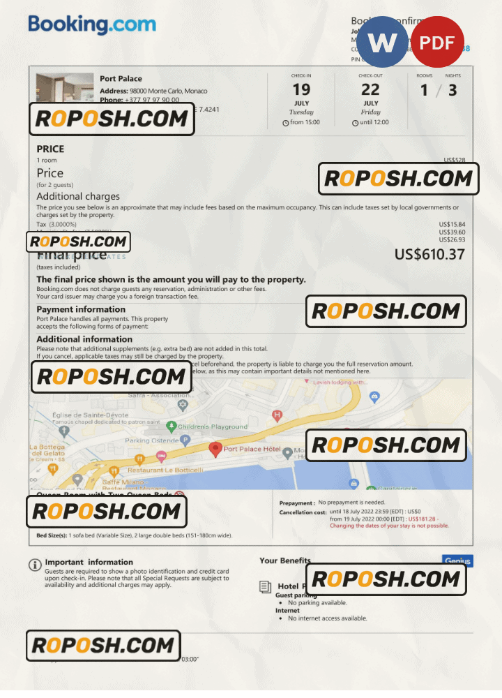 With its user-friendly design and flexible editing capabilities, this editable Monaco hotel booking confirmation hotel, room, house, and Airbnb reservation proof is the perfect choice for anyone looking to create a professional-quality editable hotel accommodation reception. So why wait?