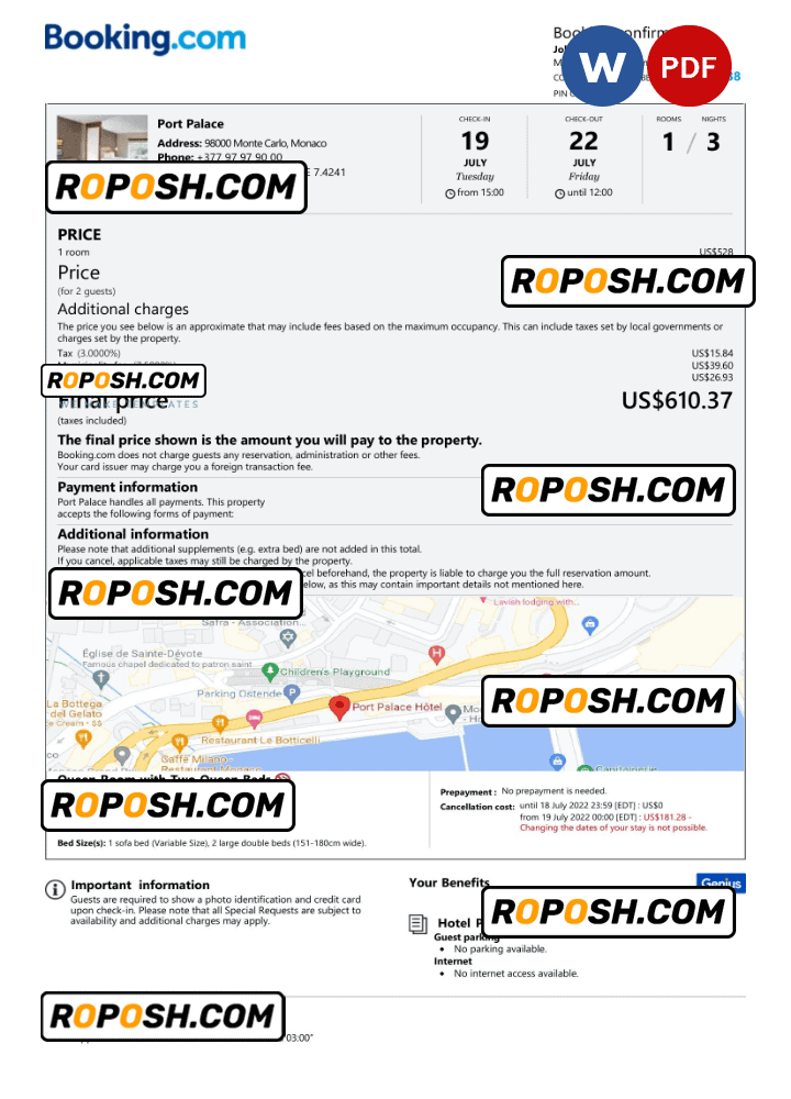 This Blank Monaco hotel booking confirmation PDF Template is perfect for a variety of uses, such as Visa applications, proof of accommodation, showing your expenses, and more. You can even use it to create realistic copies of your credit card for novelty documents. We have a variety of other templates available, including passport templates, ID card templates, reciept template, and more.