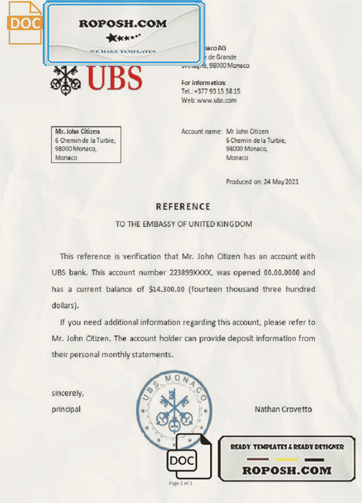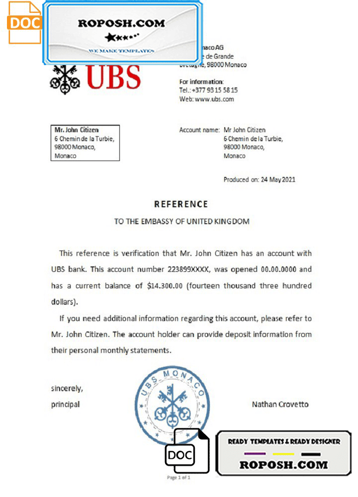 Be the first to review “Monaco UBS bank reference letter template in Word and PDF format”