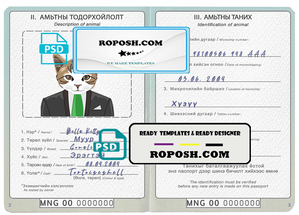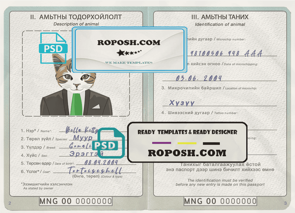 Mongolia cat (animal, pet) passport PSD template, is your one-stop-shop for realistic and editable editable pet identity cards and passports. We specialize in creating high-quality, customizable editable pet passports and identity cards for dogs, cats, and other furry friends.