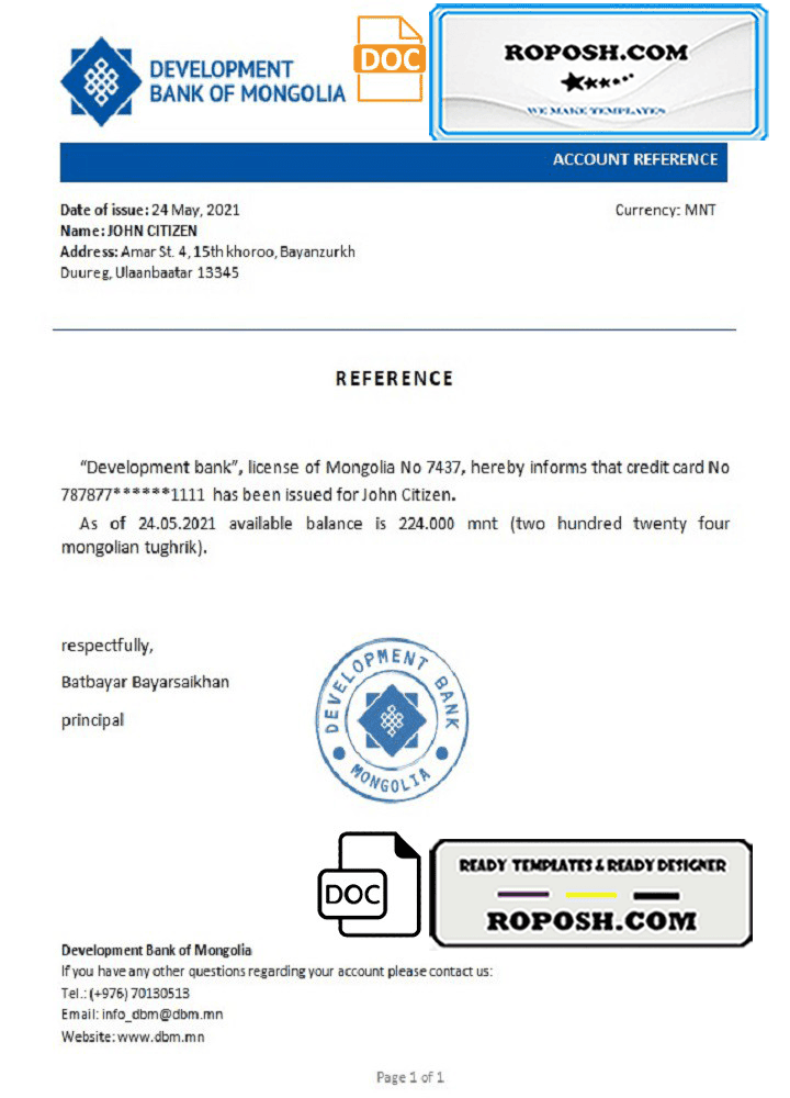 Mongolia Development Bank of Mongolia bank reference letter template in Word and PDF format