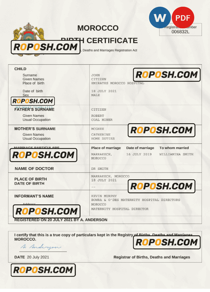 roposh offers hundreds of high-quality, realistic, and customizable birth certificates. The Morocco birth certificate template is fully fillable, and you can complete it with any information you wish, such as name, surname, birth date, place of birth and etc. Whether you are using our PSD template (a layer-based adobe photoshop file) or our PDF template (a Microsoft Office editable file) you will get a package with fonts included instantly. No need to worry even if you can’t generate realistic birth proof yourself, we offer reliable editing service with your desired information for an extra charge. Also, we are always online and here to help you experience a confident purchase. So, reach out!