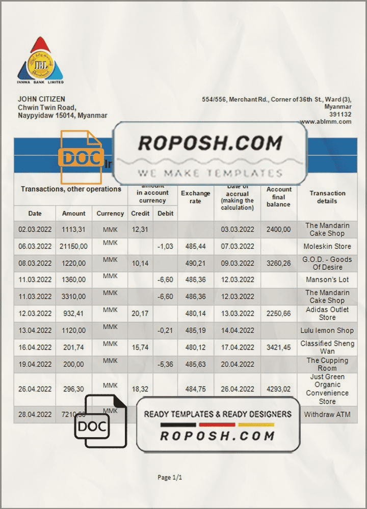 Download our high-quality, fully editable Myanmar Innwa Bank Statement Word Template from Roposh today. Ideal for creating novelty documents if your bank statement is expired, stolen, or unavailable. We also offer a wide range of other templates including editable credit cards, ID cards, driver’s licenses, and printable editable blank utility bills.