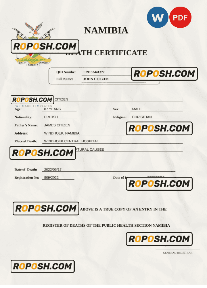 Explore a vast collection of legitimate-looking editable death certificates for several countries worldwide. The editable Namibia death certificates offers easy access to obtaining the required document for a variety of purposes, predominantly claiming life insurance, pensions, and resolving estates.