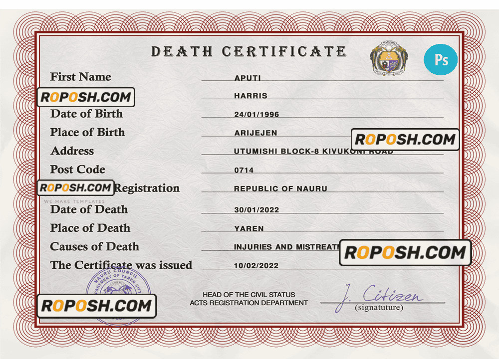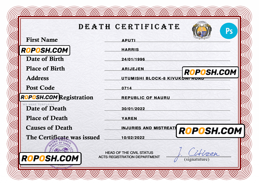 Be the first to review “Nauru vital record death certificate PSD template, fully editable”