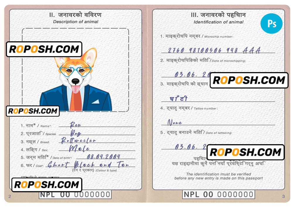 Nepal dog (animal, pet) passport PSD template, is designed to look and feel like real documents. Each template is carefully crafted to include all the necessary details, such as your pet’s name, breed, date of birth, and microchip information. With our fillable cat or dog passport templates, you can quickly and easily create a editable pet passport that meets all the requirements for international travel.