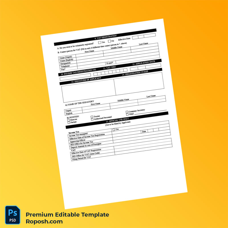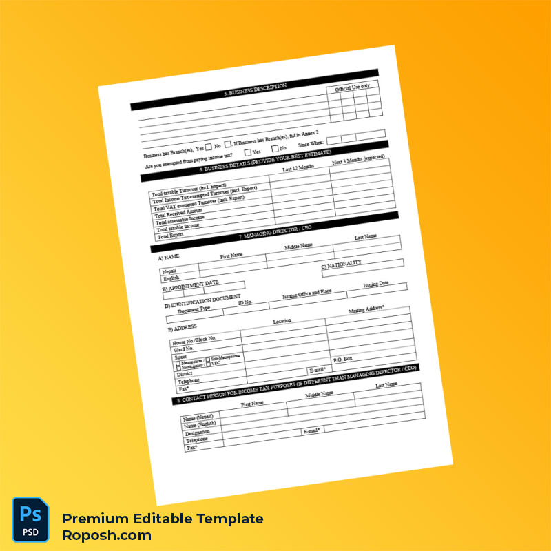 Empower your business registration process today with the Nepal Inland Revenue Office Editable PAN Application Form Editable Word & PDF Template. Experience the confidence of submitting a professionally crafted, compliant, and editable registration certificate that simplifies your workflow and accelerates your business compliance.