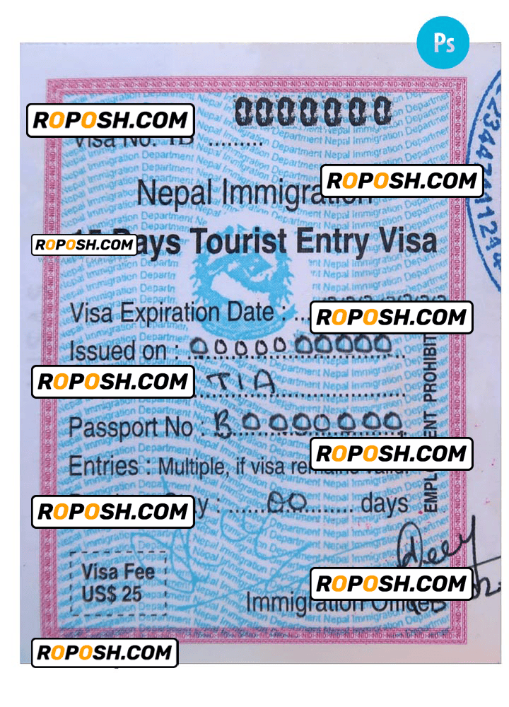 NEPAL tourist entry visa template psd. Buy Customizable Travel Visa Template with high quality and enjoy its unique features such as easy to customize, Layer based, fonts included sample. you can edit this template and put any name, address, license number, Id number, birth date, height, weight, expire date, change photos etc. This Photoshop template is a layer based psd file and it’s easy to Editing.To modify this photoshop template file you will need a Photo editing software such as Adobe Photoshop No need to be expert on editing software like adobe Photoshop. However, You just have to basic knowledge on adobe photoshop, to edit this template. Never used low quality template. Your account may be suspended. Also, if you’re looking for an editable SSN template, Roposh is by your side so you can get it easily and even for free.