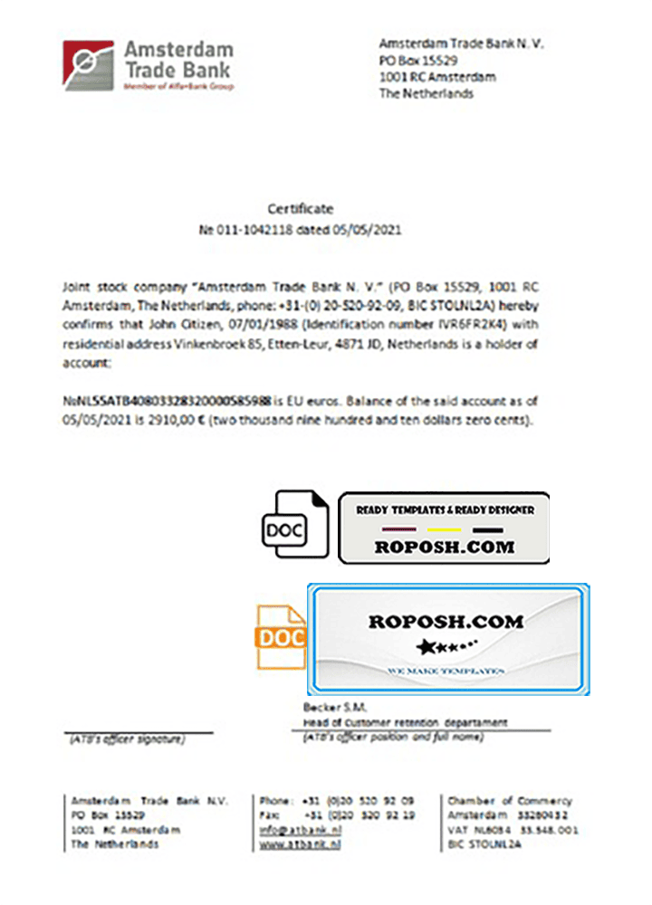 Netherlands Amsterdam Trade Bank certificate template in Word and PDF format