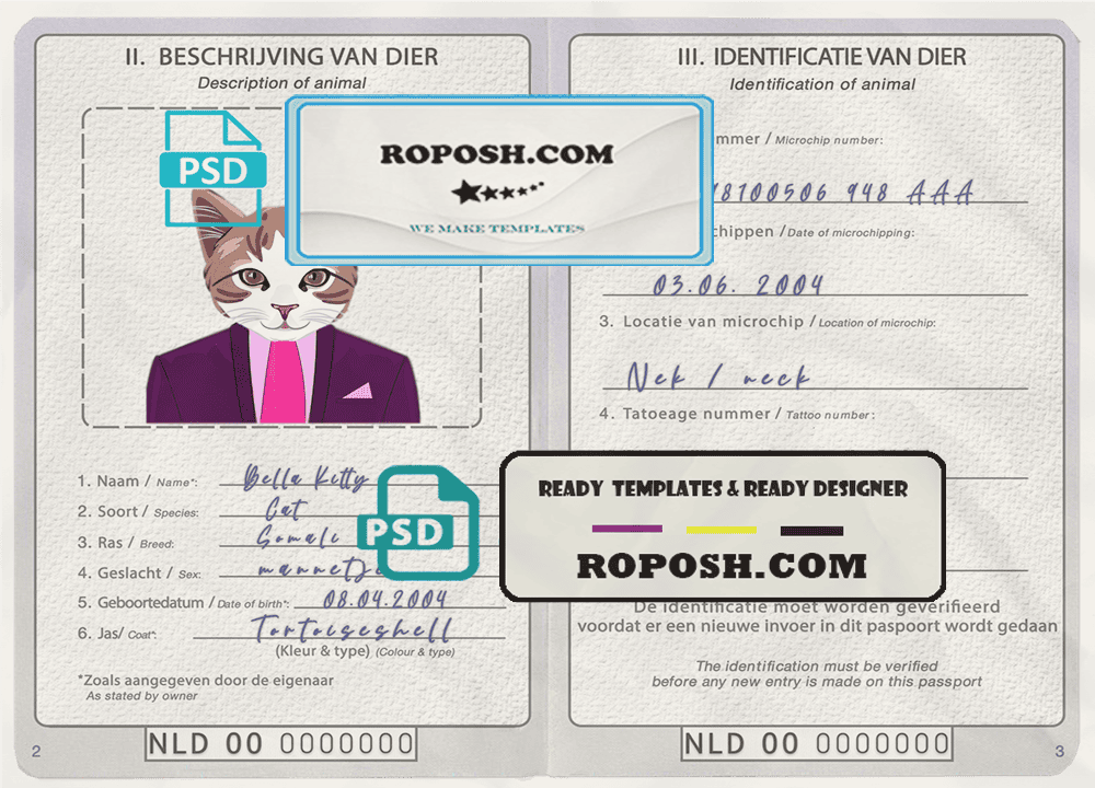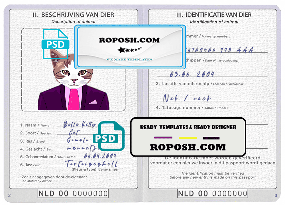 Netherlands cat (animal, pet) passport PSD template, is your one-stop-shop for realistic and editable editable pet identity cards and passports. We specialize in creating high-quality, customizable editable pet passports and identity cards for dogs, cats, and other furry friends.