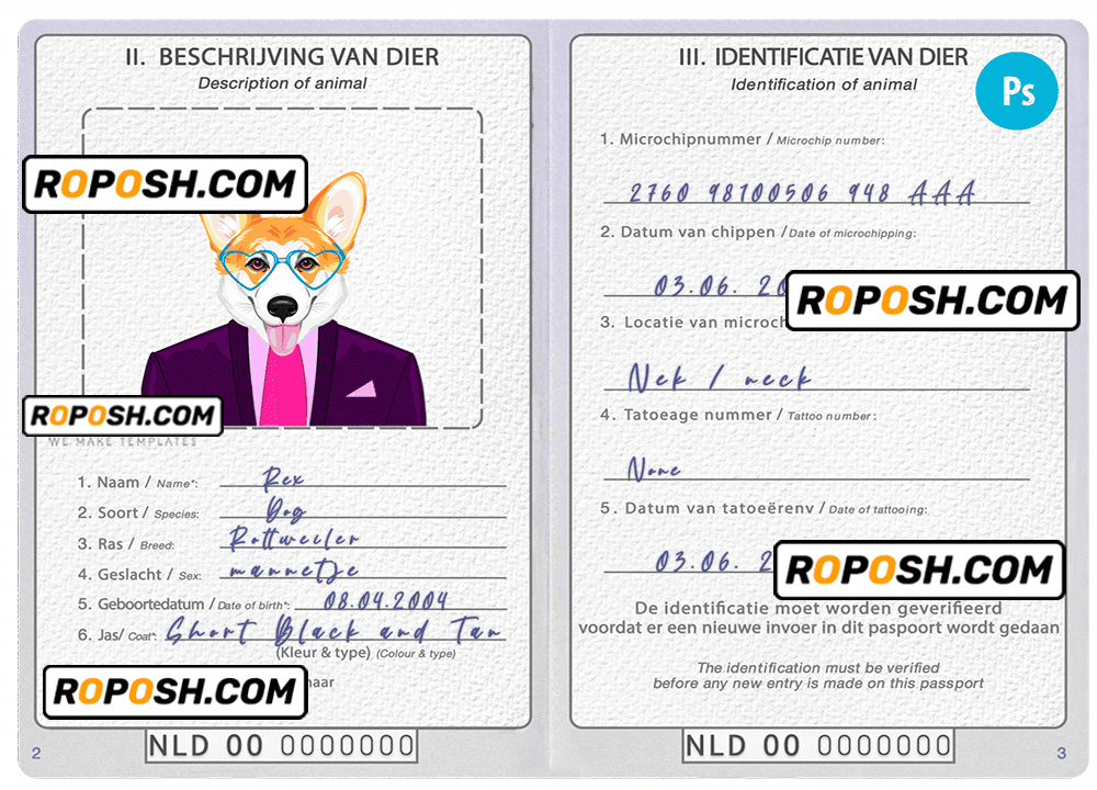 Netherlands dog (animal, pet) passport PSD template, is designed to look and feel like real documents. Each template is carefully crafted to include all the necessary details, such as your pet’s name, breed, date of birth, and microchip information. With our fillable cat or dog passport templates, you can quickly and easily create a editable pet passport that meets all the requirements for international travel.