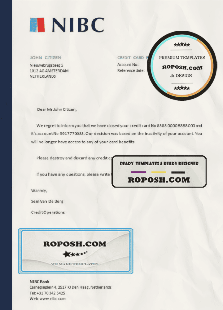 Netherlands NIBC Bank bank account closure certificate template in Word and PDF format offer high-quality customizable bank reference form template in PSD and Word format, allowing you to easily fill in your personal details and make them look authentic. Our templates are perfect for online account verification, research, presentation, or work.