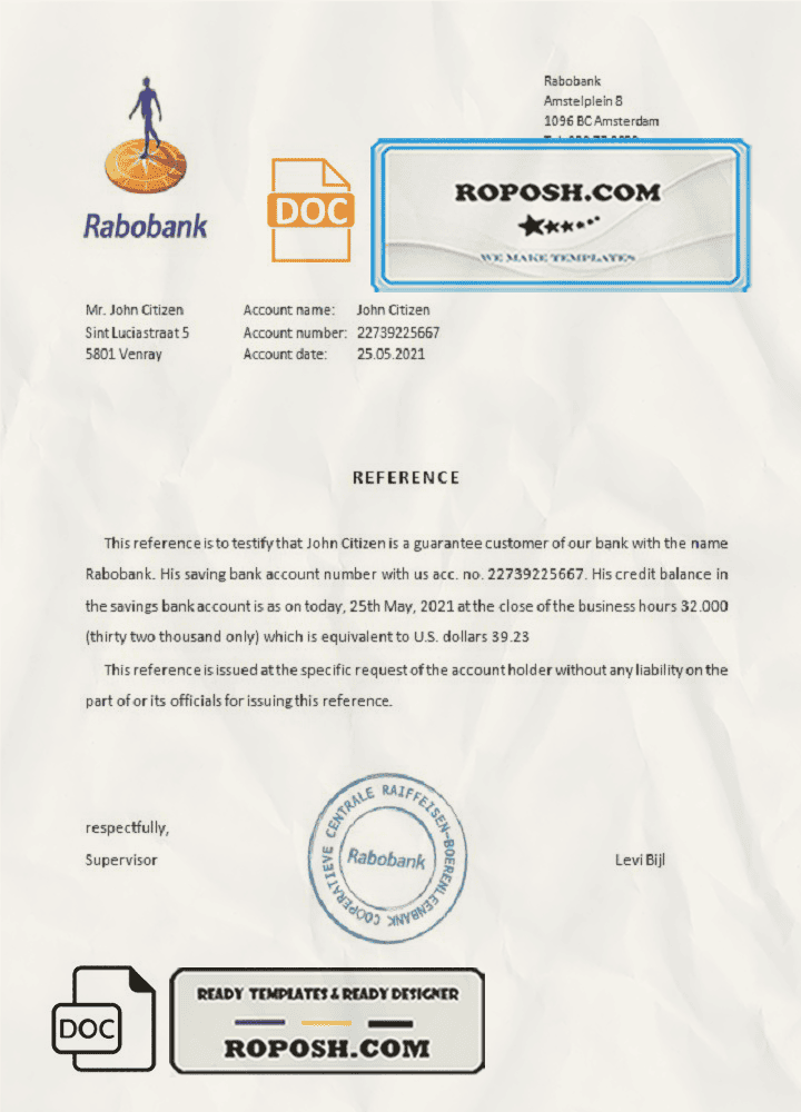 Netherlands Rabobank bank certificate template in Word and PDF format