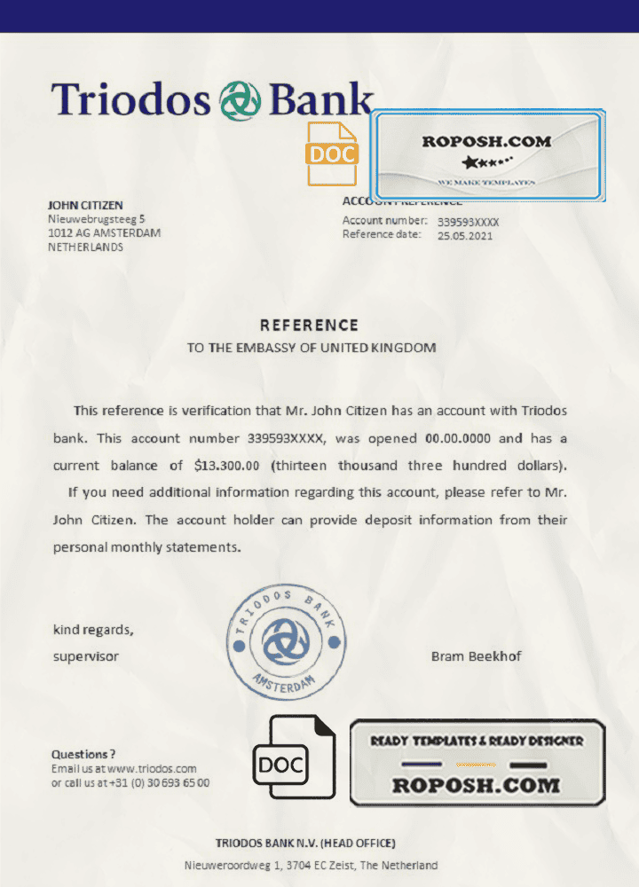 Netherlands Triodos Bank bank certificate template in Word and PDF format