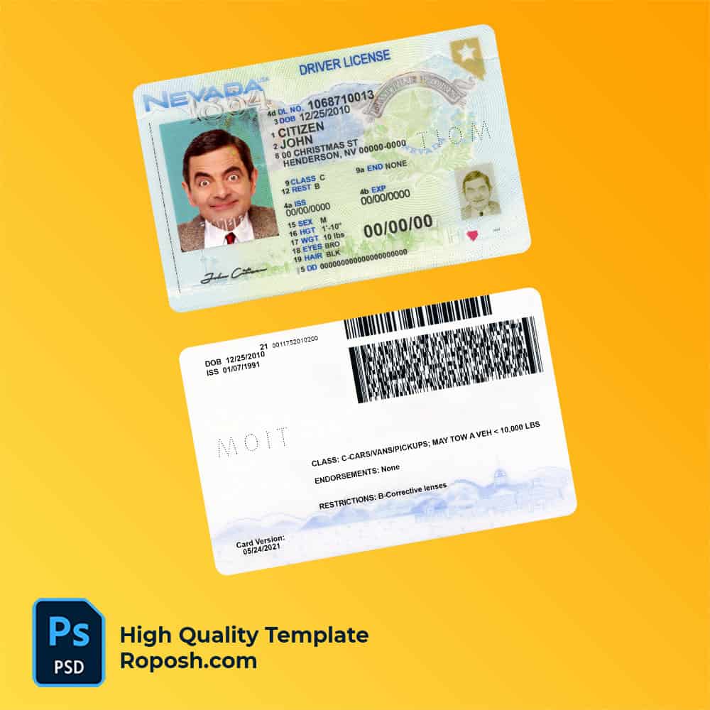 Nevada is known for its distinct driver’s license layout, high-level security elements, and vibrant colors. A professional-quality PSD template enables you to replicate these features for: