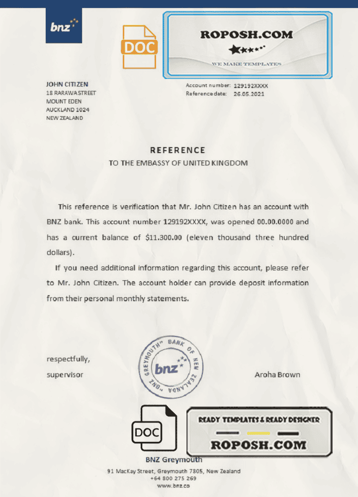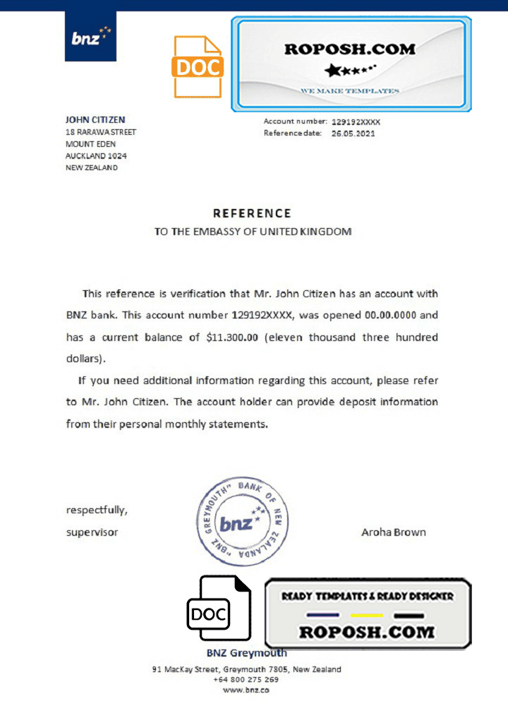 New Zealand BNZ bank account reference letter template in Word and PDF format
