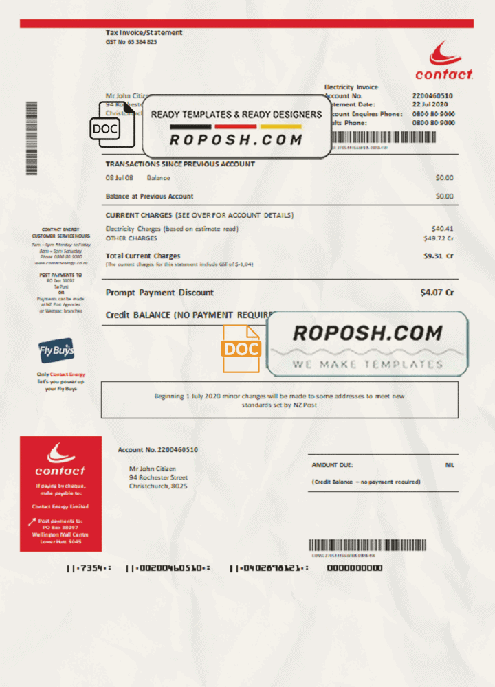 Get your hands on a blank New Zealand Contact Energy utility bill template from Roposh. Customize it with your own information to create a realistic proof of address document. This template is especially useful if your original utility bill is expired, lost, or unavailable. We also offer a range of other templates including passport PSD templates, ID card PSD templates, bank statement PSD templates, driver’s license PSD templates, and utility bill PSD templates.