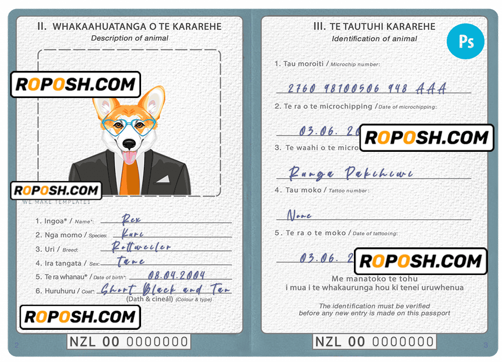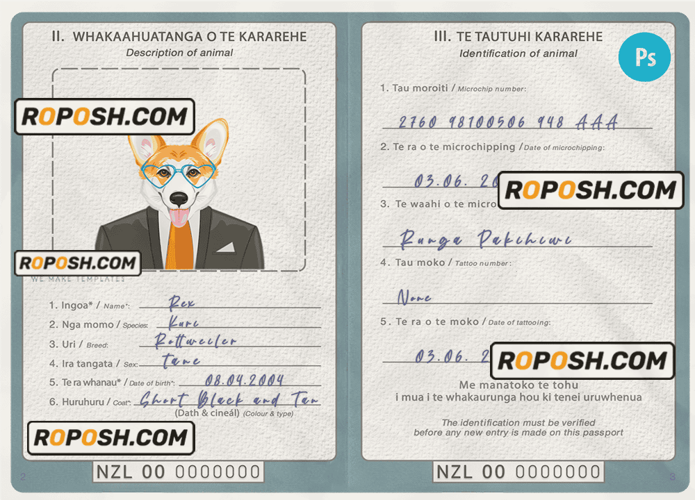 New Zealand dog (animal, pet) passport PSD template, is your one-stop-shop for realistic and editable editable pet identity cards and passports. We specialize in creating high-quality, customizable editable pet passports and identity cards for dogs, cats, and other furry friends.