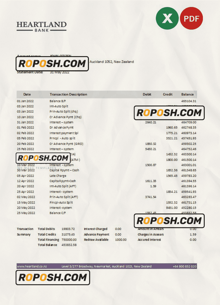 New Zealand Heartland bank statement Template in Excel an PDF format use for :