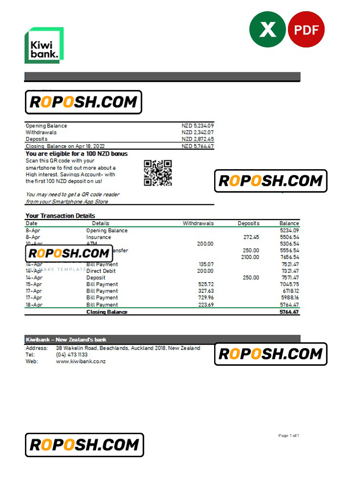 New Zealand Kiwibank bank statement template in Excel an PDF format