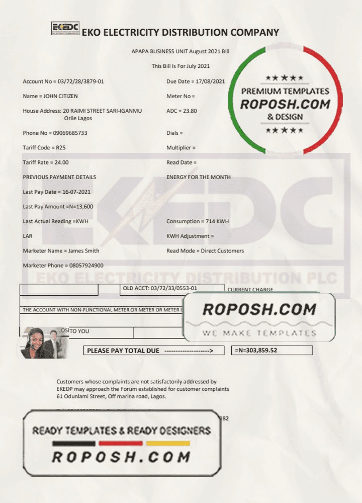 Get your blank Nigeria Eko Electricity Distribution Company (EKEDC) utility bill template from Roposh today. Customize it with your information to create a editable utility bill for proof of address. Ideal for situations where your utility bill is expired, stolen, or unavailable. We also offer a variety of other templates, including passport PSD templates, ID card PSD templates, bank statement PSD templates, driver’s license PSD templates, and utility bill PSD templates.