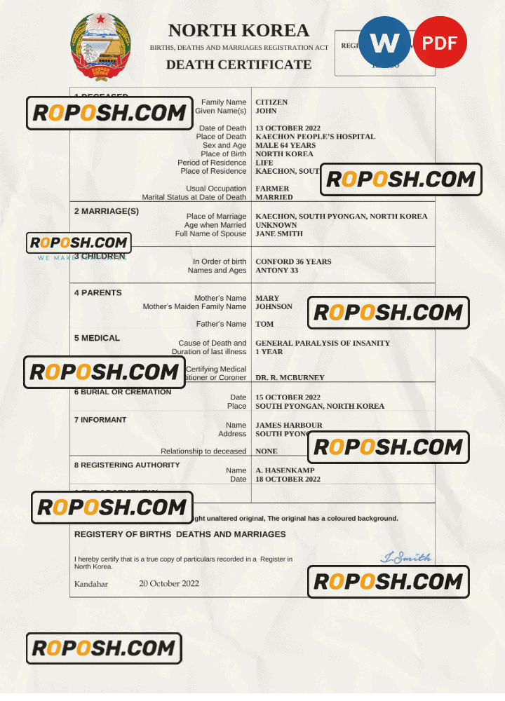 Explore a vast collection of legitimate-looking editable death certificates for several countries worldwide. The editable North Korea death certificates offers easy access to obtaining the required document for a variety of purposes, predominantly claiming life insurance, pensions, and resolving estates.
