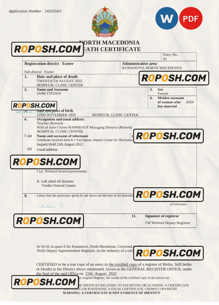 Why waste precious time on tedious bureaucracies? Buy our outstanding editable death certificate now and rely on roposh to provide the high-quality counterfeit document available on the market – all for the sake of you and your family’s recovery.