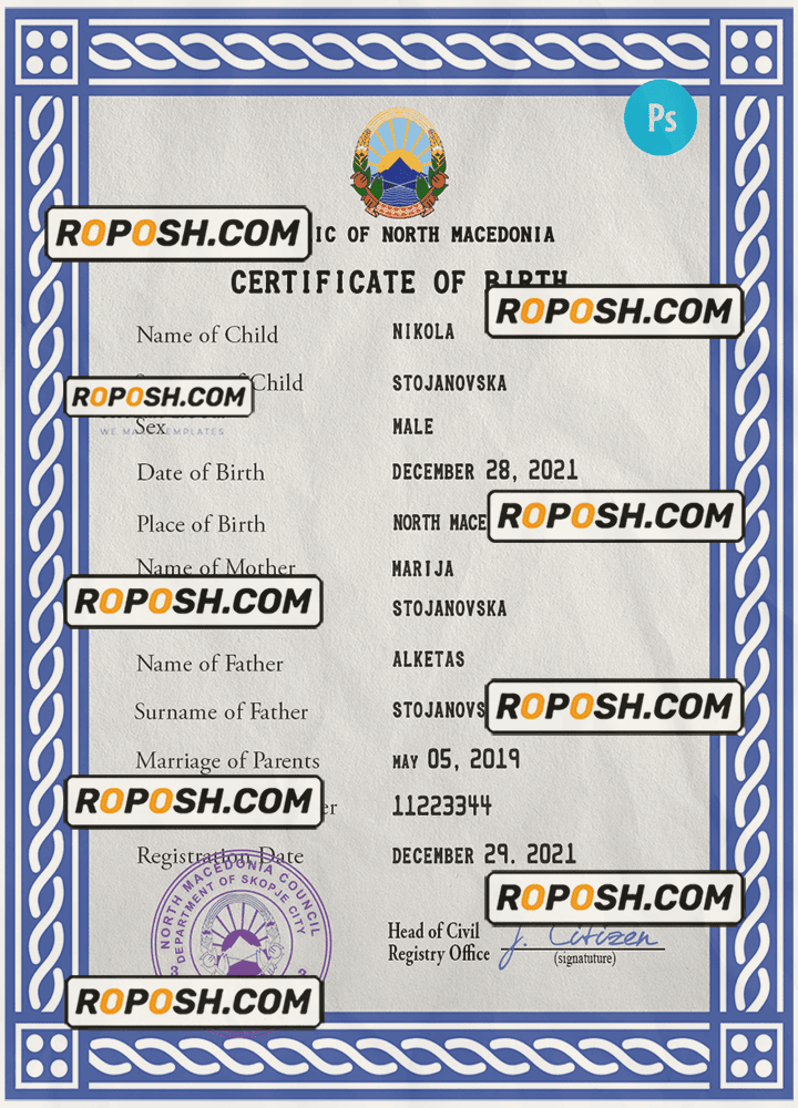 roposh offers hundreds of high-quality, realistic, and customizable birth certificates. The North Macedonia birth certificate template is fully fillable, and you can complete it with any information you wish, such as name, surname, birth date, place of birth and etc. Whether you are using our PSD template (a layer-based adobe photoshop file) or our PDF template (a Microsoft Office editable file) you will get a package with fonts included instantly. No need to worry even if you can’t generate realistic birth proof yourself, we offer reliable editing service with your desired information for an extra charge. Also, we are always online and here to help you experience a confident purchase. So, reach out!