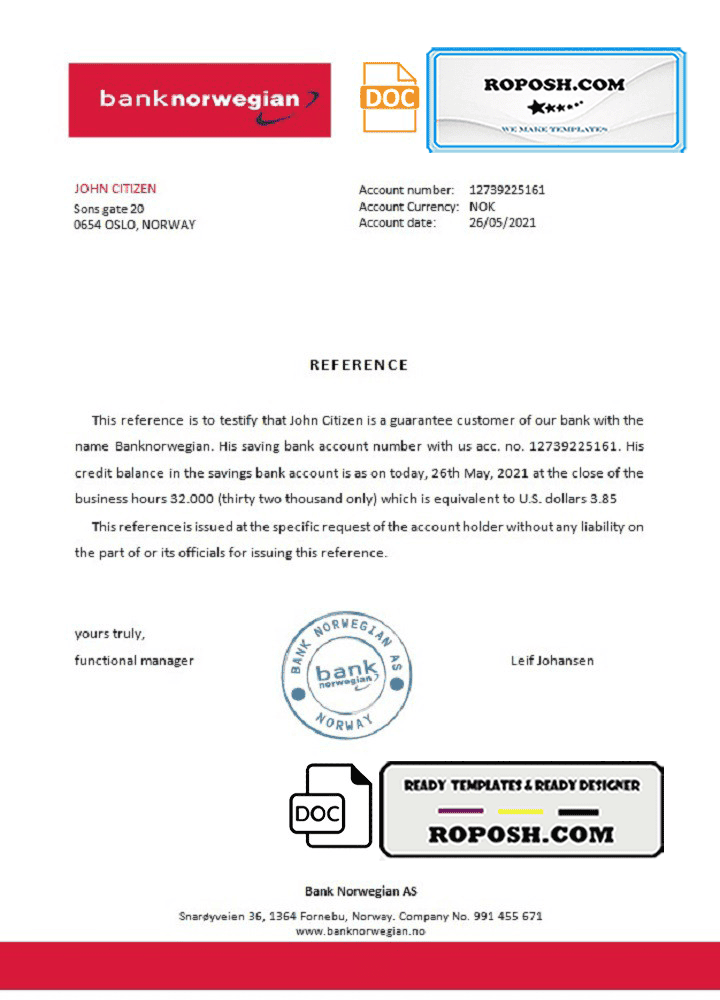 Norway Bank Norwegian bank account reference letter template in Word and PDF format