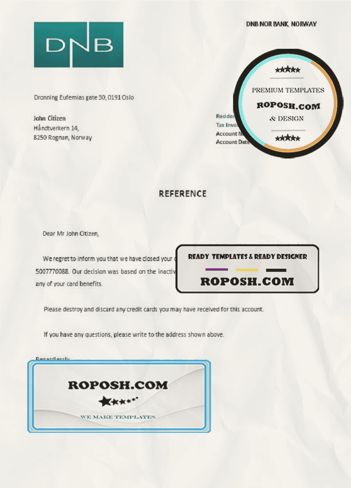 Norway DNB Nor Bank bank account closure reference letter template in Word and PDF format