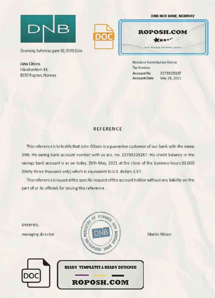 Norway DNB Nor Bank bank account reference letter template in Word and PDF format