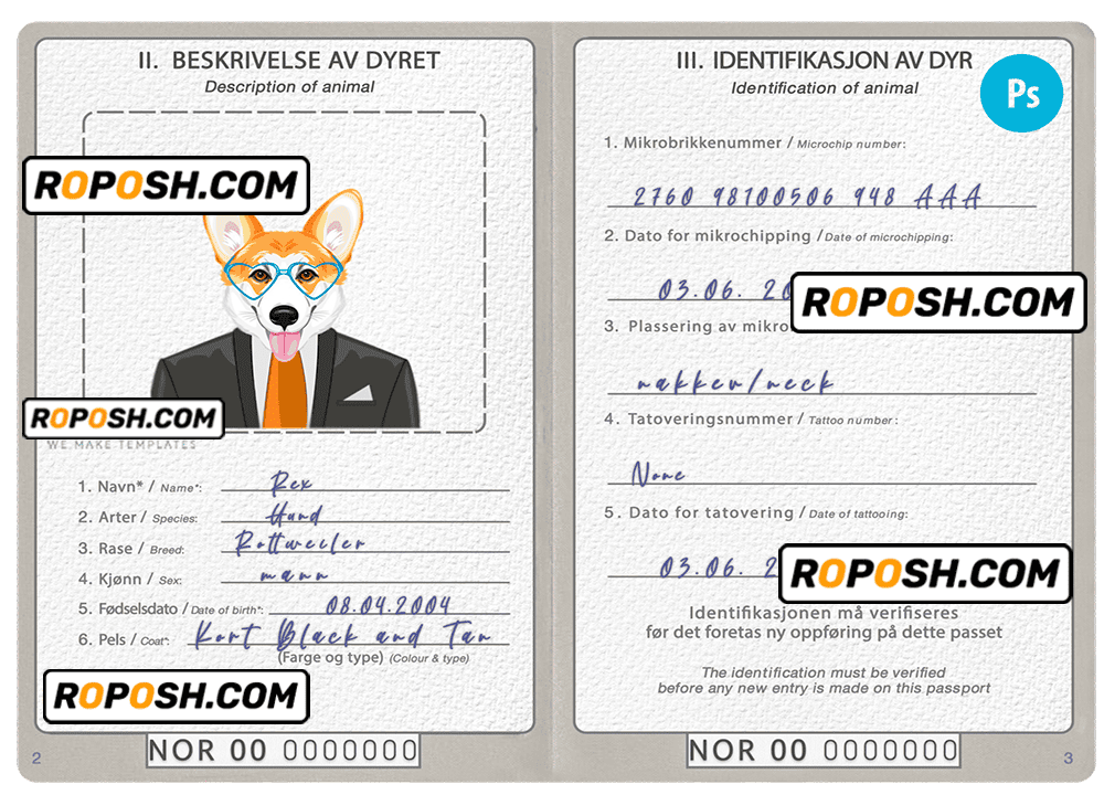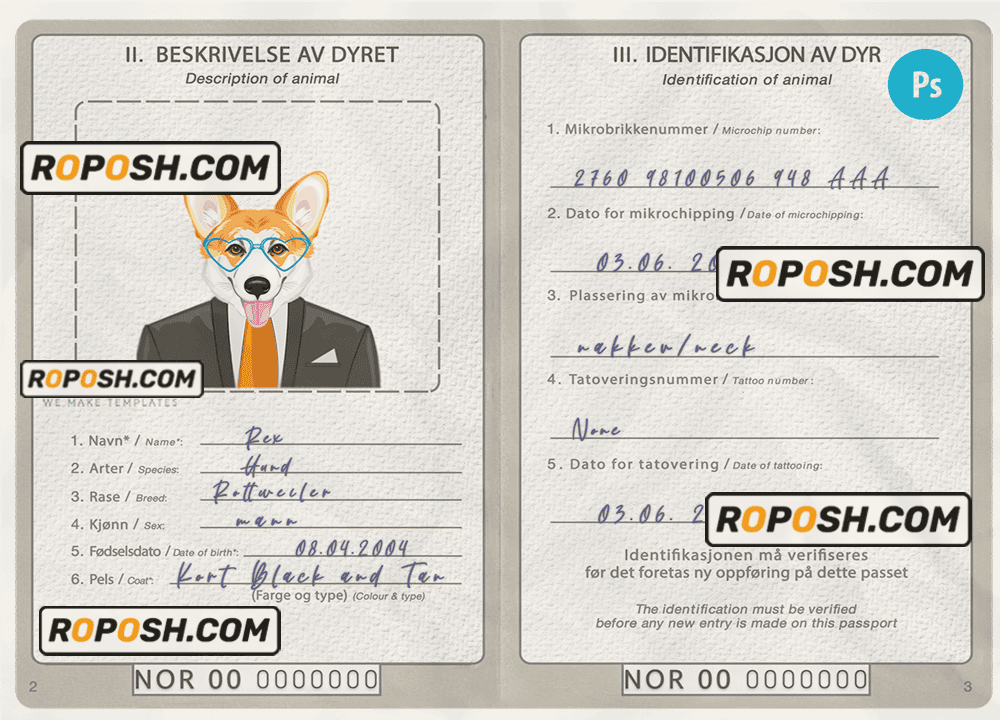 Norway dog (animal, pet) passport PSD template, is your one-stop-shop for realistic and editable editable pet identity cards and passports. We specialize in creating high-quality, customizable editable pet passports and identity cards for dogs, cats, and other furry friends.