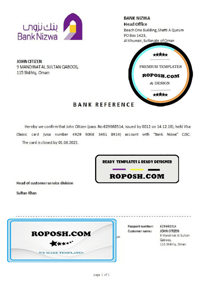 Oman Bank Nizwa bank account closure reference letter template in Word and PDF format offer high-quality customizable bank reference form template in PSD and Word format, allowing you to easily fill in your personal details and make them look authentic. Our templates are perfect for online account verification, research, presentation, or work.