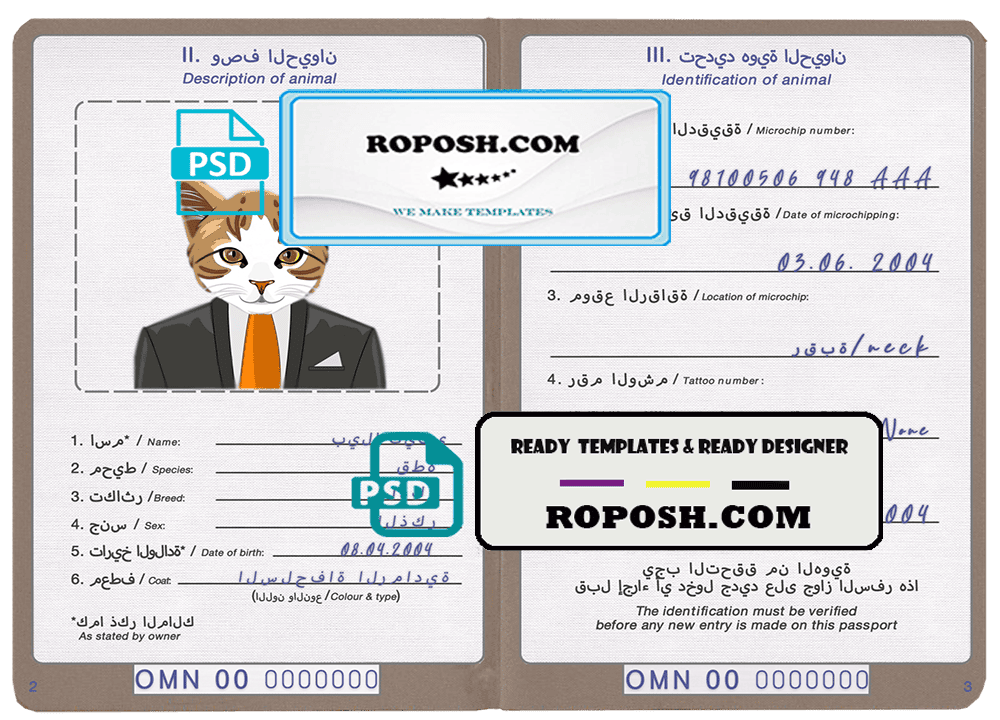 Oman cat (animal, pet) passport PSD template, is your one-stop-shop for realistic and editable editable pet identity cards and passports. We specialize in creating high-quality, customizable editable pet passports and identity cards for dogs, cats, and other furry friends.