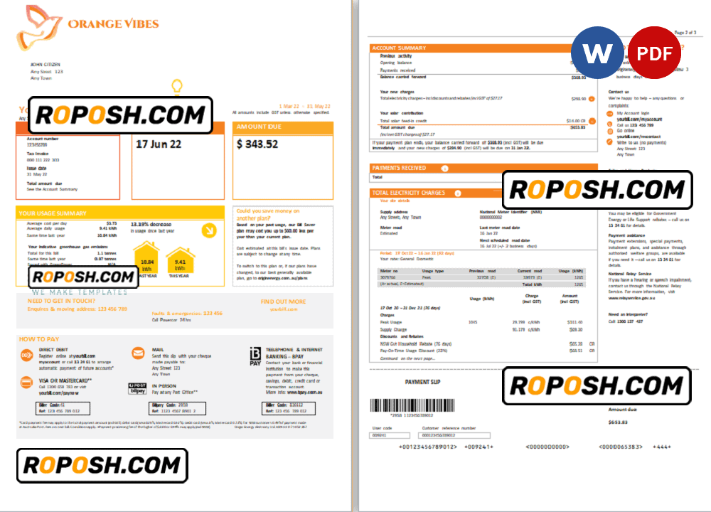 Get your hands on the Blank Orange Vibes Universal Multipurpose Utility Bill Template from Roposh. Customize it with your own information to create a editable utility bill for proof of address. Ideal for situations where your utility bill is expired, stolen, or unavailable. Explore our range of templates including passport PSD templates, ID card PSD templates, Bank Statement PSD templates, driver’s license PSD templates, and Utility Bill PSD templates.