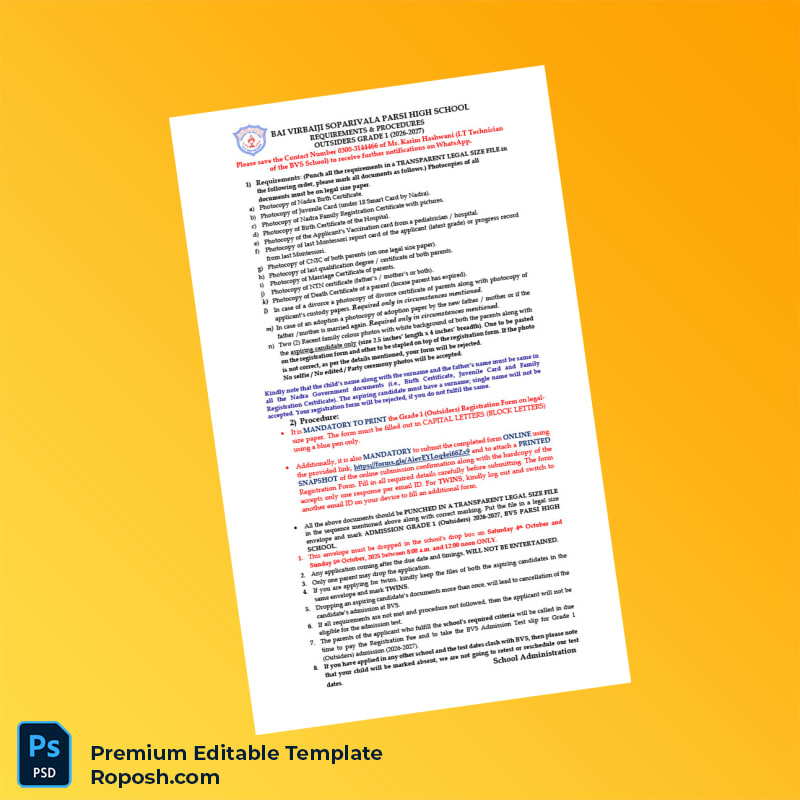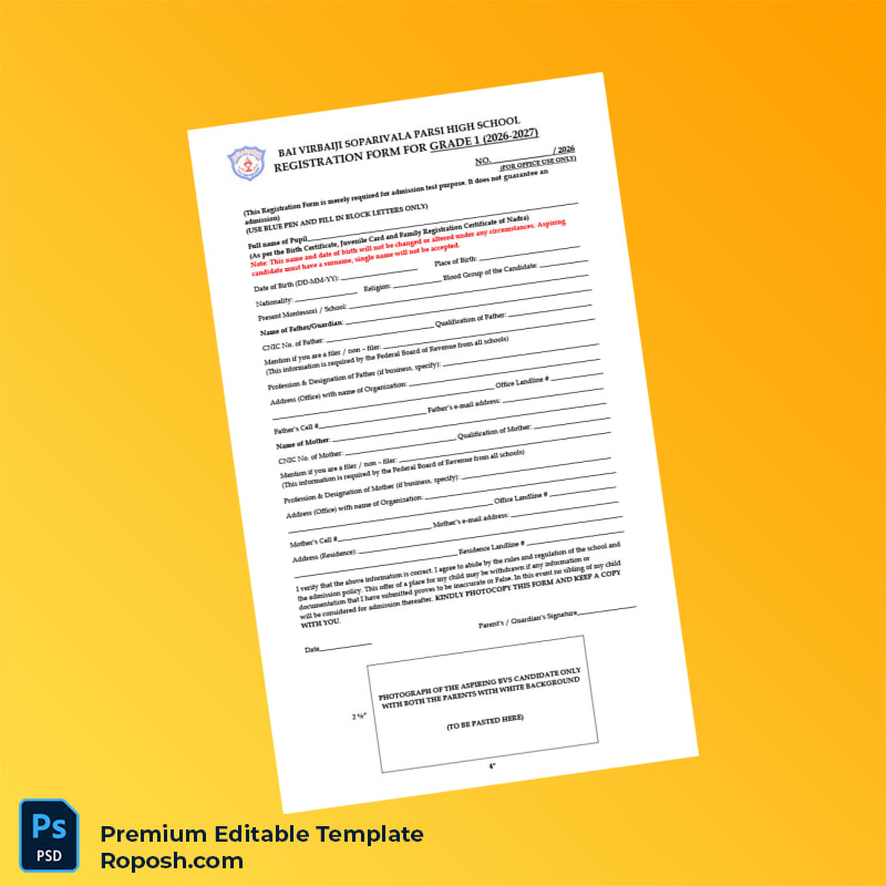 Are you struggling to manage student registrations for Pakistan Bai Virbajii Soparivala Parsi High School Grade 1? Simplify your administrative workload with the Pakistan Bai Virbajii Soparivala Parsi High School Grade 1 Registration Form Editable Word & PDF Template. Designed for educational institutions seeking a professional and easy-to-use registration certificate template, this reliable form enables you to swiftly process new student admissions without hassle.