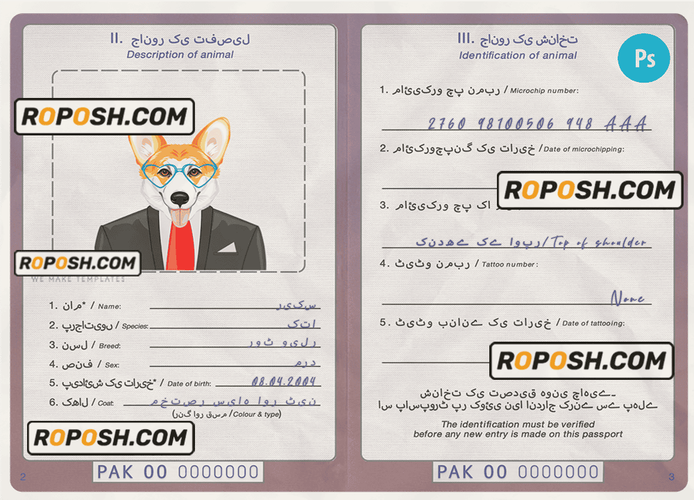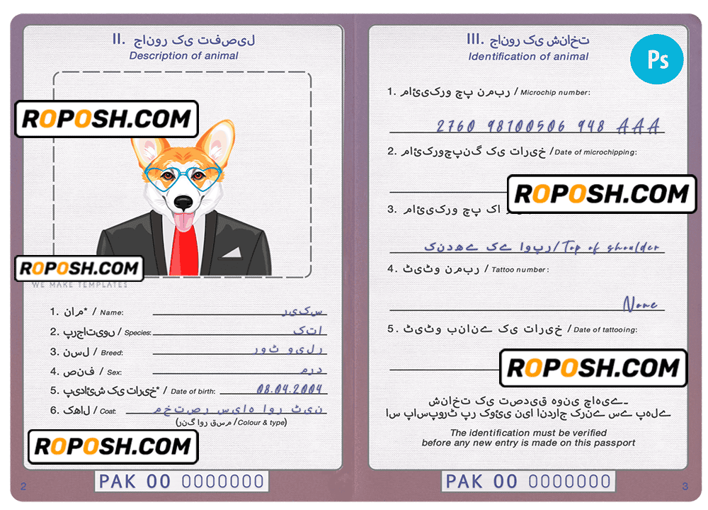 Pakistan dog (animal, pet) passport PSD template, is your one-stop-shop for realistic and editable editable pet identity cards and passports. We specialize in creating high-quality, customizable editable pet passports and identity cards for dogs, cats, and other furry friends.