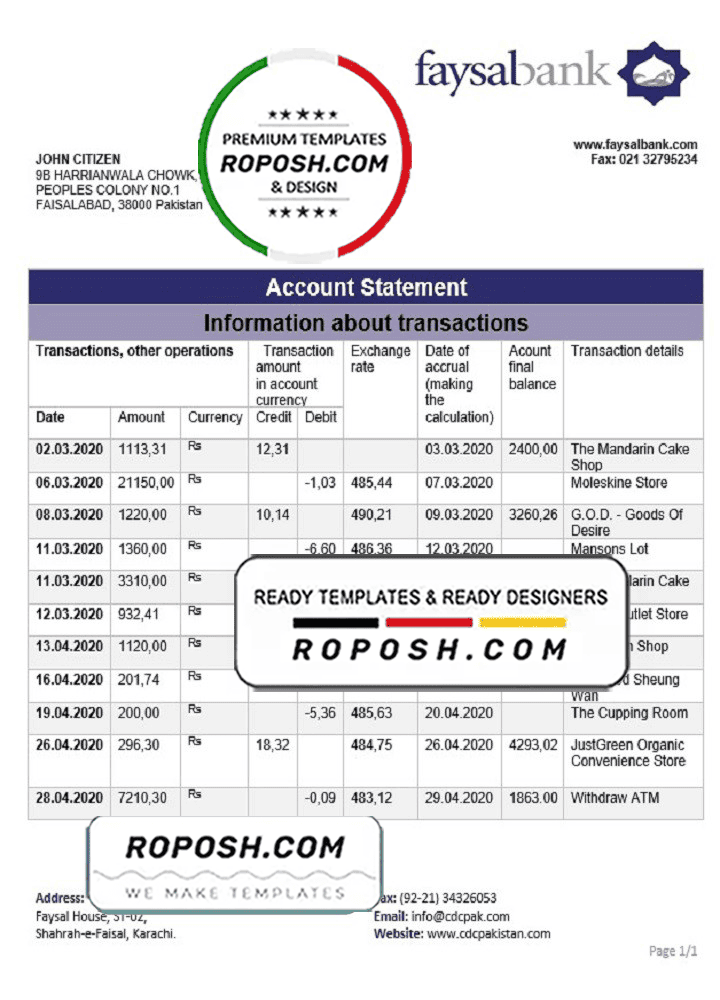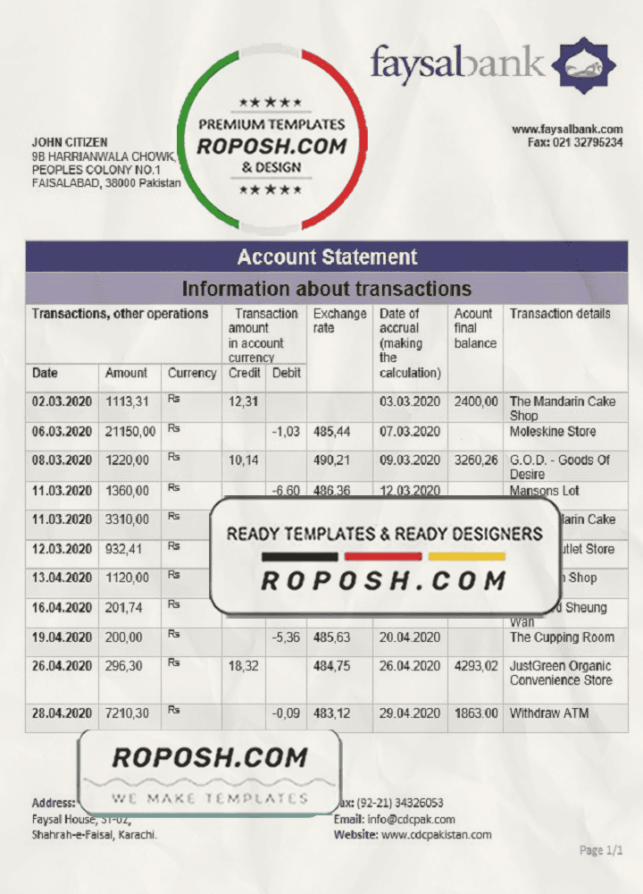 Grab now fully editable Pakistan Faysal bank statement Word Template from our website Roposh and put your own info to create Realistic Bank Statement Word template and ready your own novelty documents. It’ll be so beneficial if your Bank Statement is expired, stolen or not available.We also have editable credit card, ID Card psd template, Bank Statement psd template, drivers license psd template & printable editable blank utility bill template.