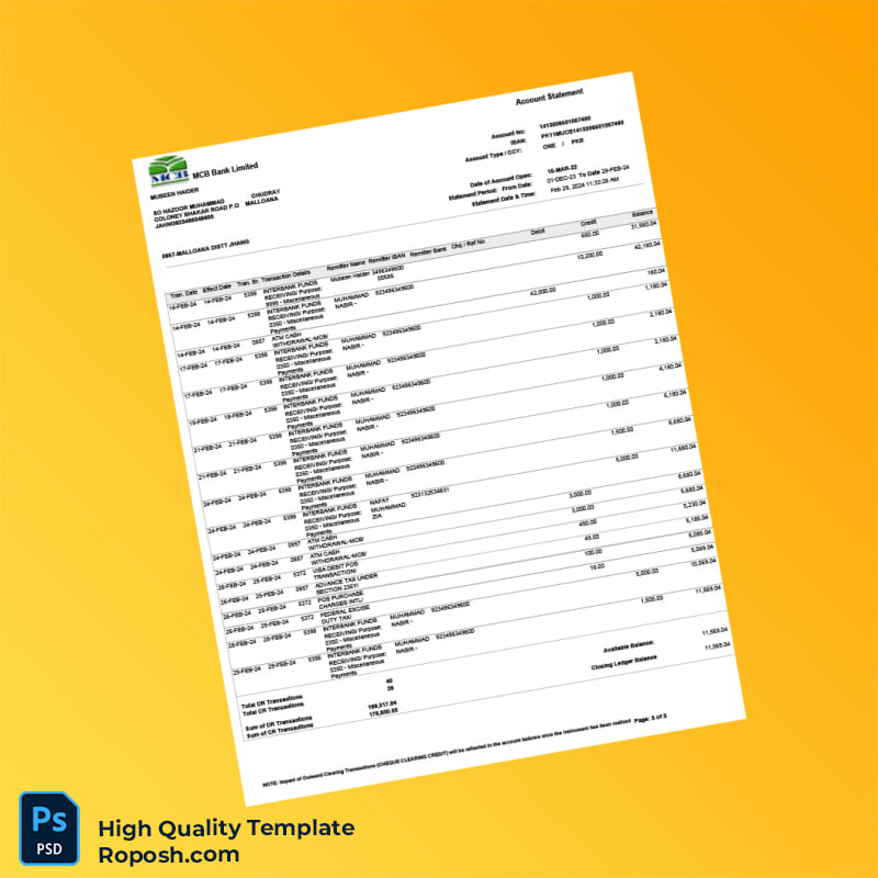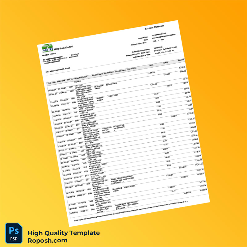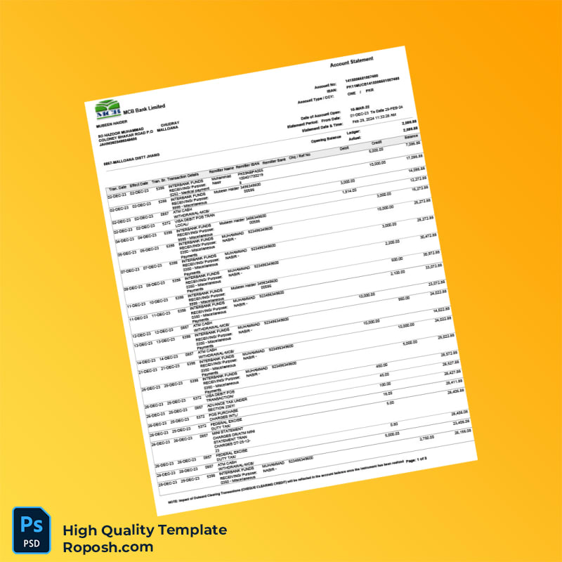 Elevate Your Documentation with the Pakistan MCB Bank Statement Template: Seamlessly navigate the complexities of financial documentation with our expertly crafted bank statement template in Word and PDF formats. Designed for professionals in need of quick, reliable, and customizable financial records, this template offers a practical solution to your document needs.
