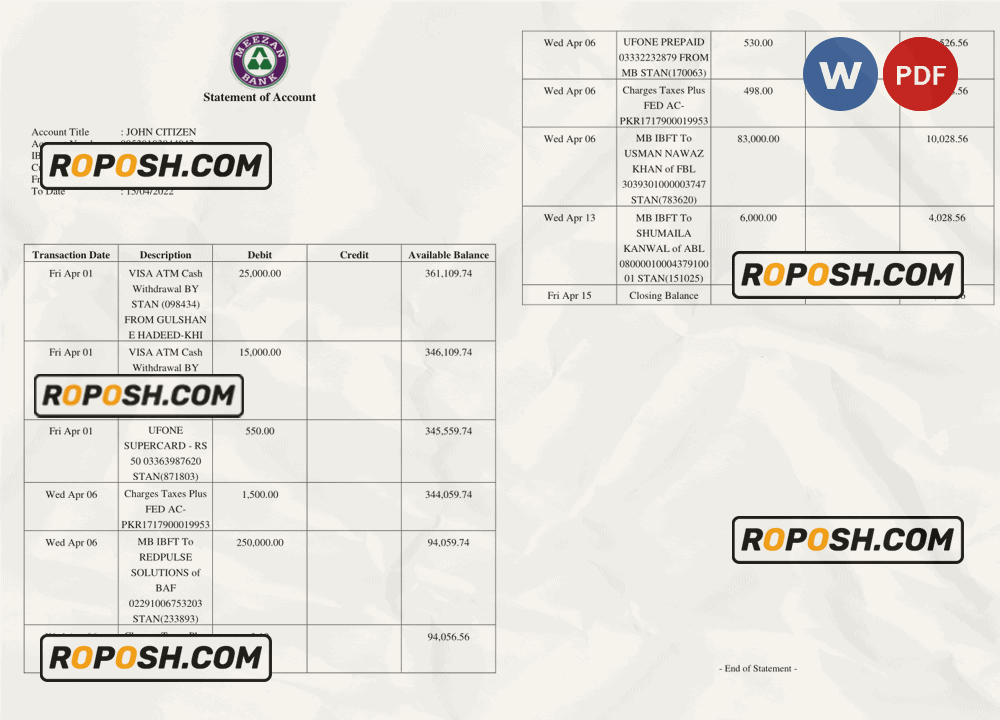 Download our fully editable Pakistan Meezan Bank Statement Word Template from Roposh and customize it with your own information to create realistic novelty documents. Ideal for situations where your bank statement is expired, stolen, or unavailable. We also offer editable credit card templates, ID card templates, bank statement PSD templates, driver’s license PSD templates, and printable editable blank utility bill templates.