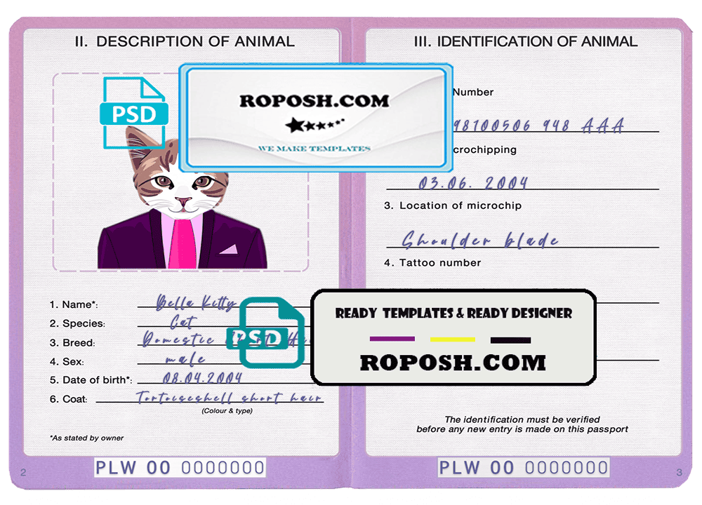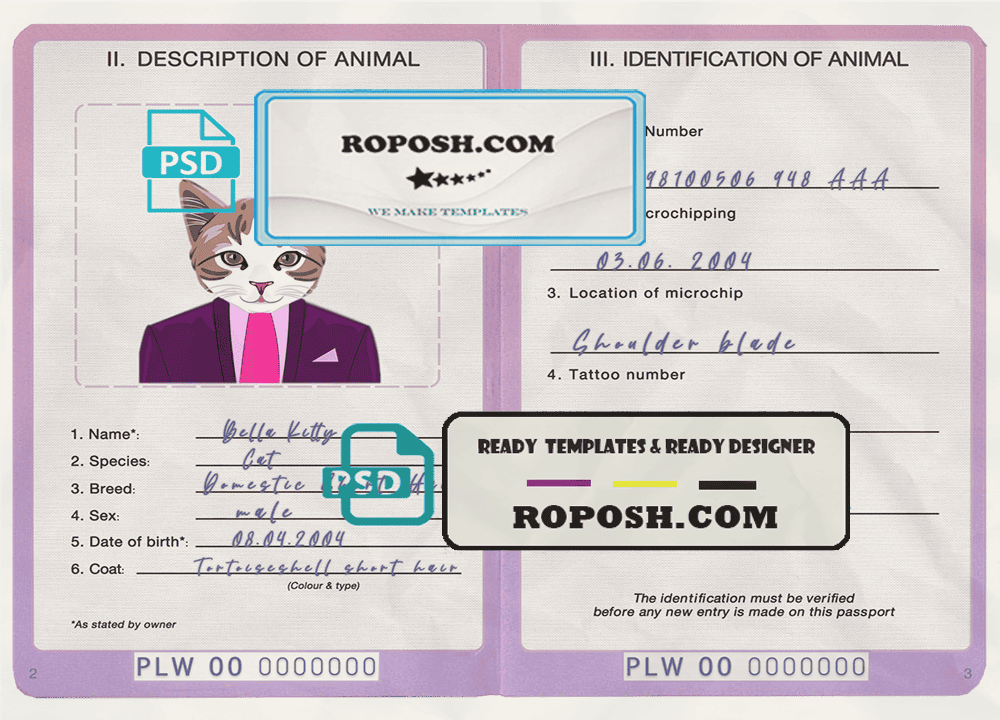 Palau cat (animal, pet) passport PSD template, is designed to look and feel like real documents. Each template is carefully crafted to include all the necessary details, such as your pet’s name, breed, date of birth, and microchip information. With our fillable cat or dog passport templates, you can quickly and easily create a editable pet passport that meets all the requirements for international travel.