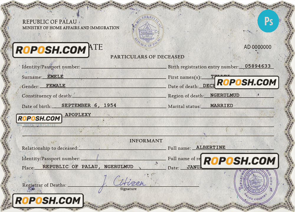Explore a vast collection of legitimate-looking editable death certificates for several countries worldwide. The editable Palau death certificates offers easy access to obtaining the required document for a variety of purposes, predominantly claiming life insurance, pensions, and resolving estates.
