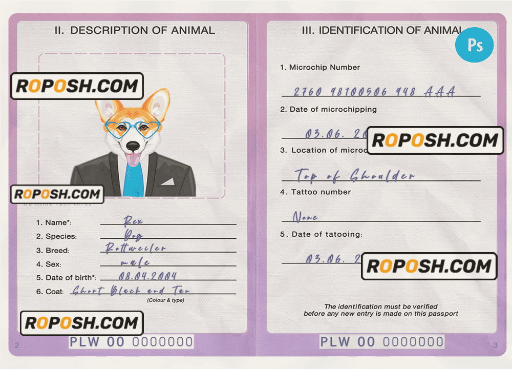 Palau dog (animal, pet) passport PSD template, is designed to look and feel like real documents. Each template is carefully crafted to include all the necessary details, such as your pet’s name, breed, date of birth, and microchip information. With our fillable cat or dog passport templates, you can quickly and easily create a editable pet passport that meets all the requirements for international travel.