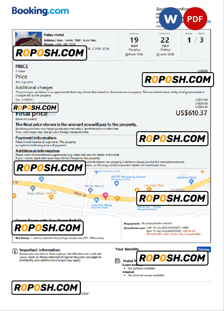 With its user-friendly design and flexible editing capabilities, this editable Palau hotel booking confirmation hotel, room, house, and Airbnb reservation proof is the perfect choice for anyone looking to create a professional-quality editable hotel accommodation reception. So why wait?