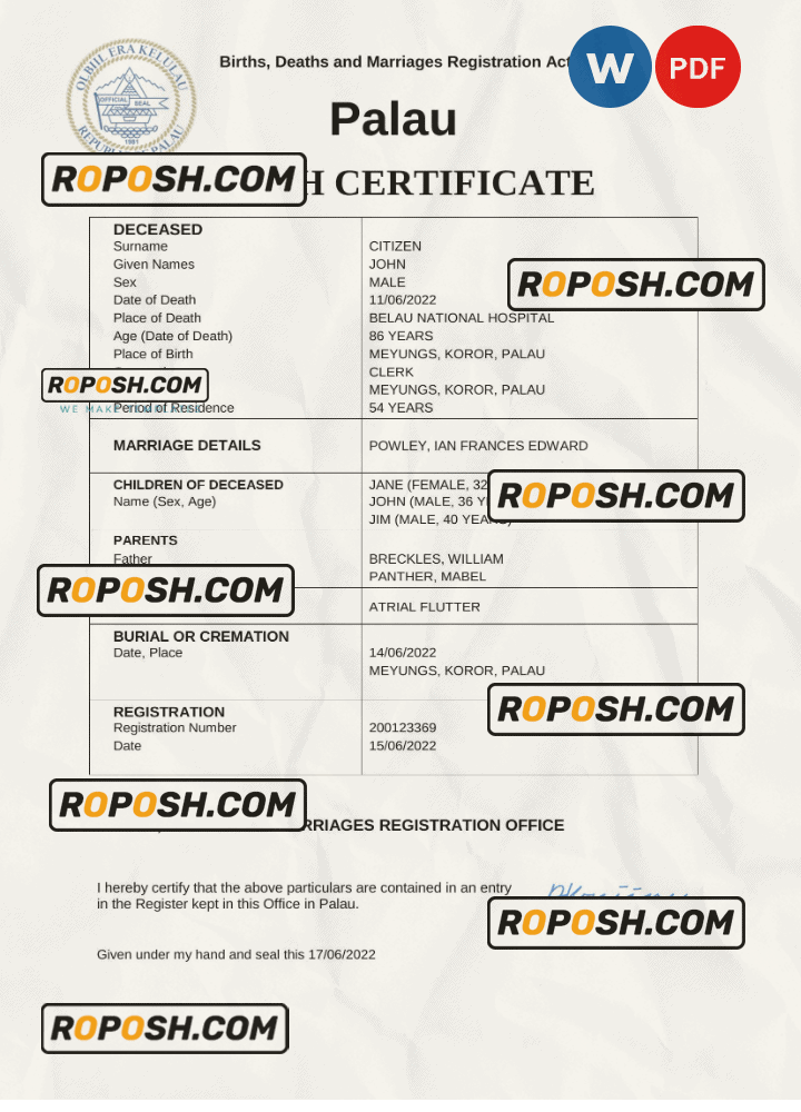 Explore a vast collection of legitimate-looking editable death certificates for several countries worldwide. The editable Palau death certificates offers easy access to obtaining the required document for a variety of purposes, predominantly claiming life insurance, pensions, and resolving estates.