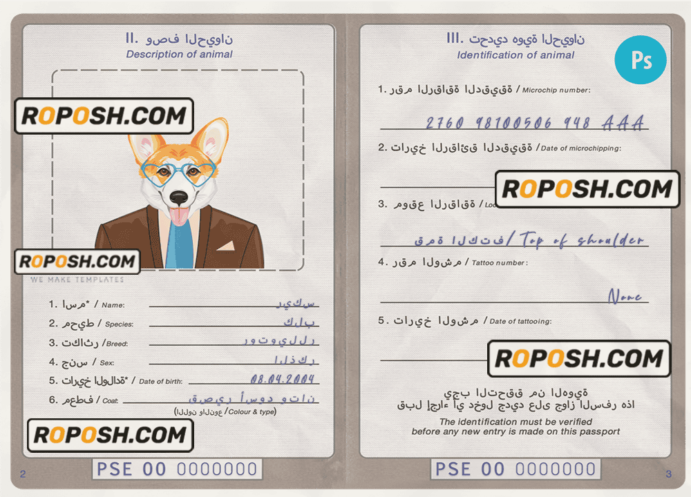 Palestine dog (animal, pet) passport PSD template, is your one-stop-shop for realistic and editable editable pet identity cards and passports. We specialize in creating high-quality, customizable editable pet passports and identity cards for dogs, cats, and other furry friends.