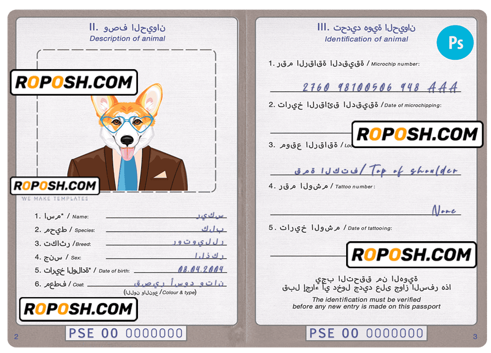 Palestine dog (animal, pet) passport PSD template, is designed to look and feel like real documents. Each template is carefully crafted to include all the necessary details, such as your pet’s name, breed, date of birth, and microchip information. With our fillable cat or dog passport templates, you can quickly and easily create a editable pet passport that meets all the requirements for international travel.