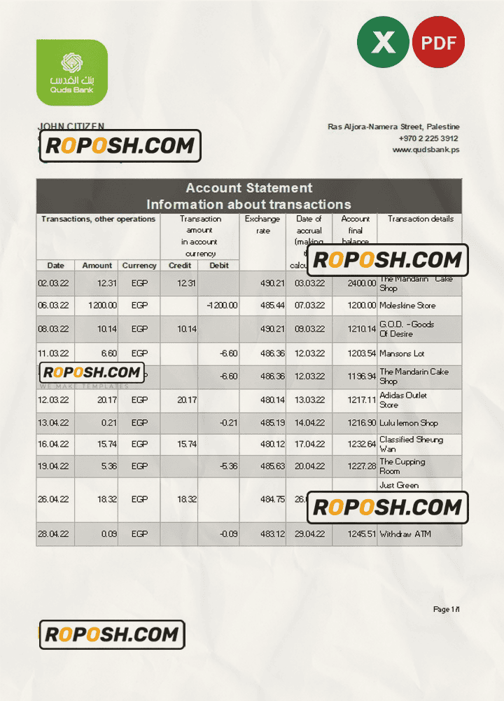 Grab now fully editable Palestine Quds bank statement Excel Template from our website Roposh and put your own info to create Realistic Bank Statement template Excel and ready your own novelty documents. It’ll be so beneficial if your Bank Statement is expired, stolen or not available.We also have editable credit card, ID Card psd template, Bank Statement psd template, drivers license psd template & printable editable blank utility bill template.