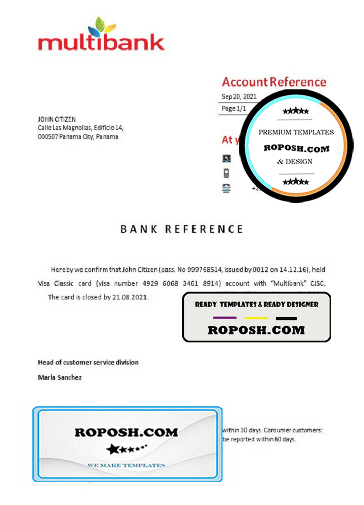 Panama Multibank bank account closure reference letter template in Word and PDF format